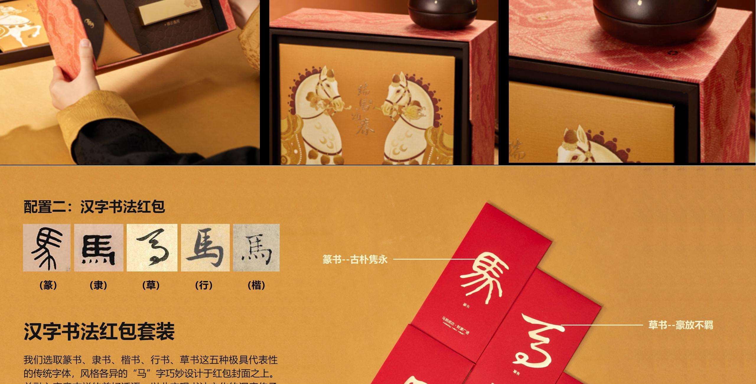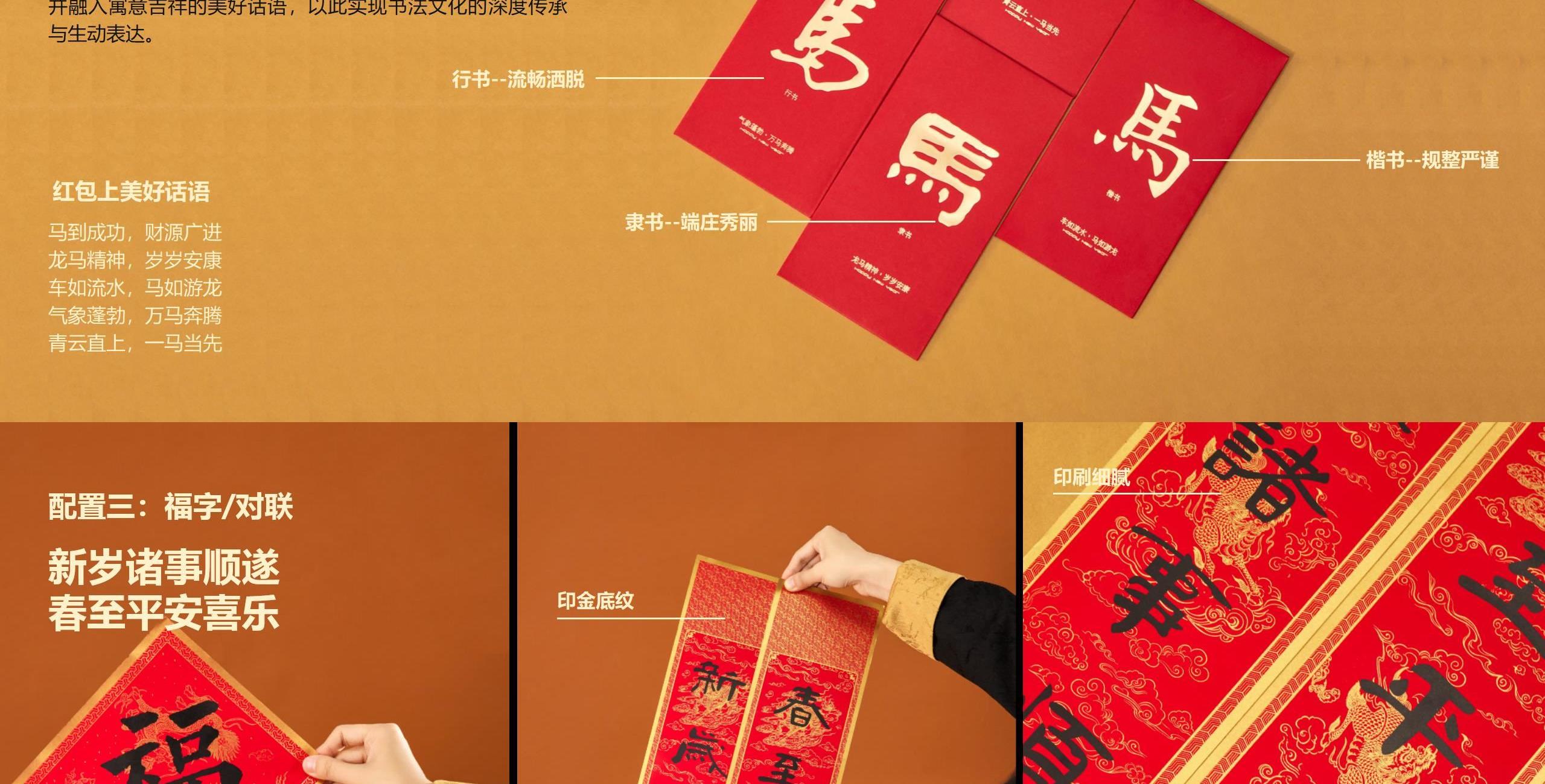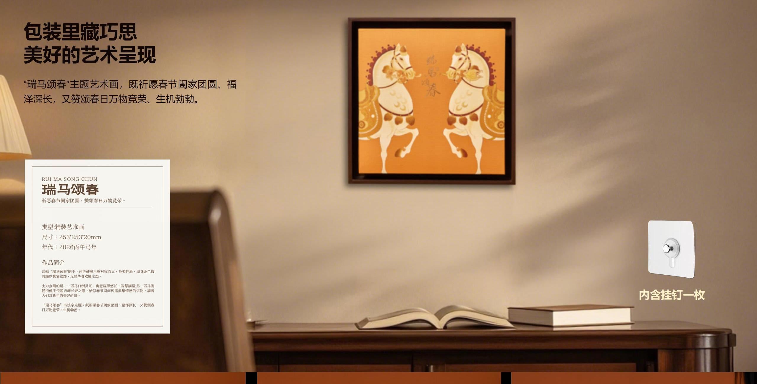礼盒尺寸:26*26*12cm 手提袋尺寸:28*13*29cm 礼盒挂画尺寸:25.3*25.3*2cm 对联尺寸:75*13cm 设计理念:瑞马颂春是一件融合了传统智慧与现代美学的艺术佳品。它通过铜钱纹与宫廷纹样的交融,将新年对财富、团圆、吉祥的期盼,以一种极具文化自信与尊贵格调的方式娓娓道来。主视觉插画为“瑞马颂春",两匹神骏白驹对称而立,身姿轩昂,周身金色鞍具缀以繁复纹饰,尽显华贵欢愉之态。尤为点睛的是,一匹马口衔灵芝,寓意福泽悠长、智慧满溢;另一匹马则轻衔佛手传递吉祥长寿之愿,恰似春节期间传递真挚情感的信物,满着人们对新年的美好祈盼。