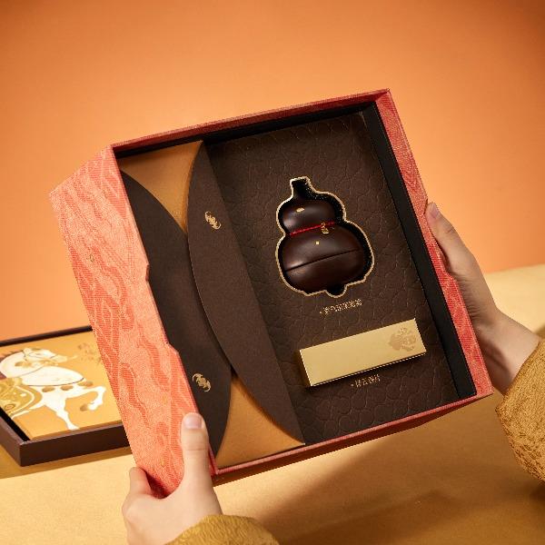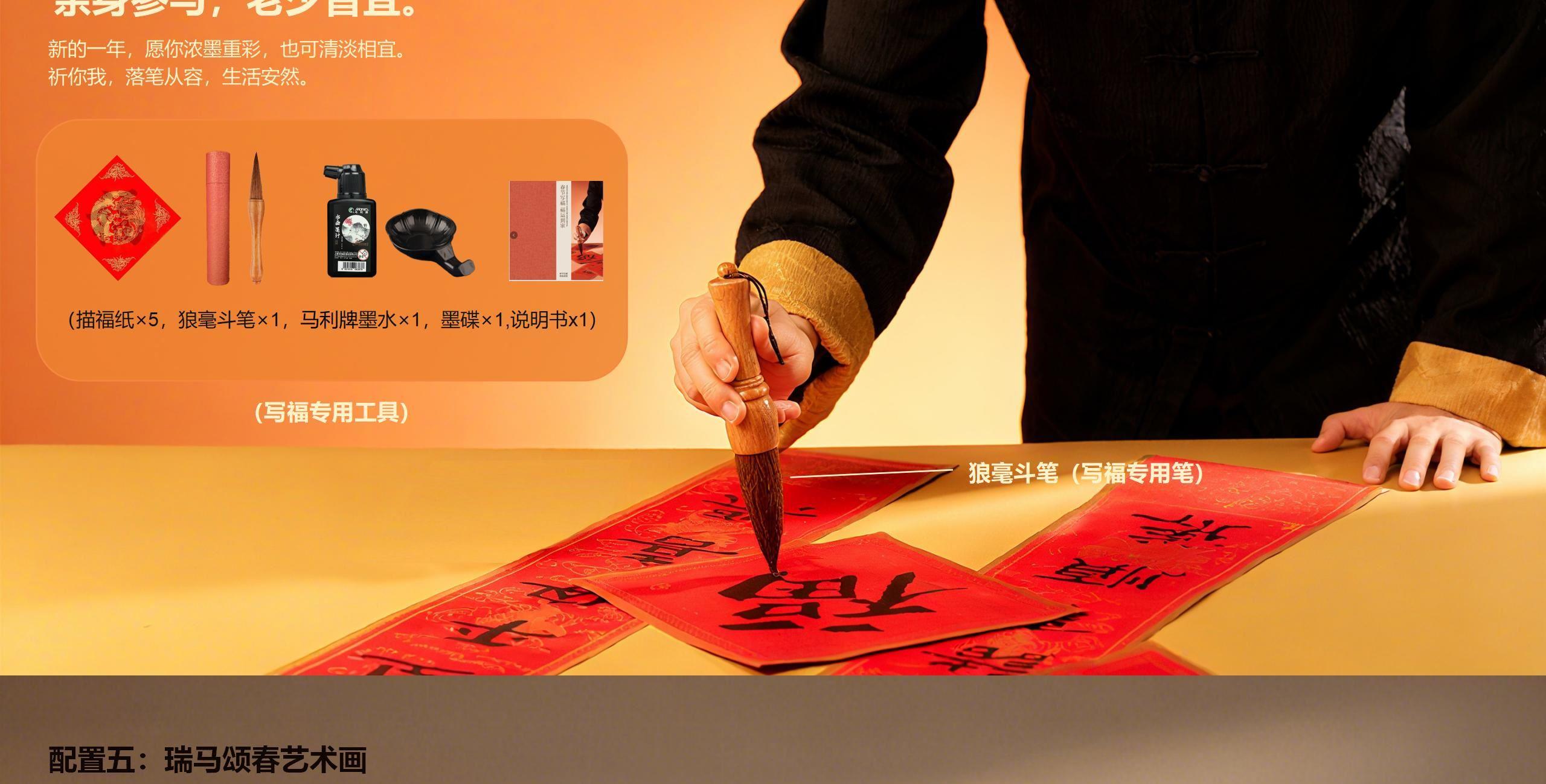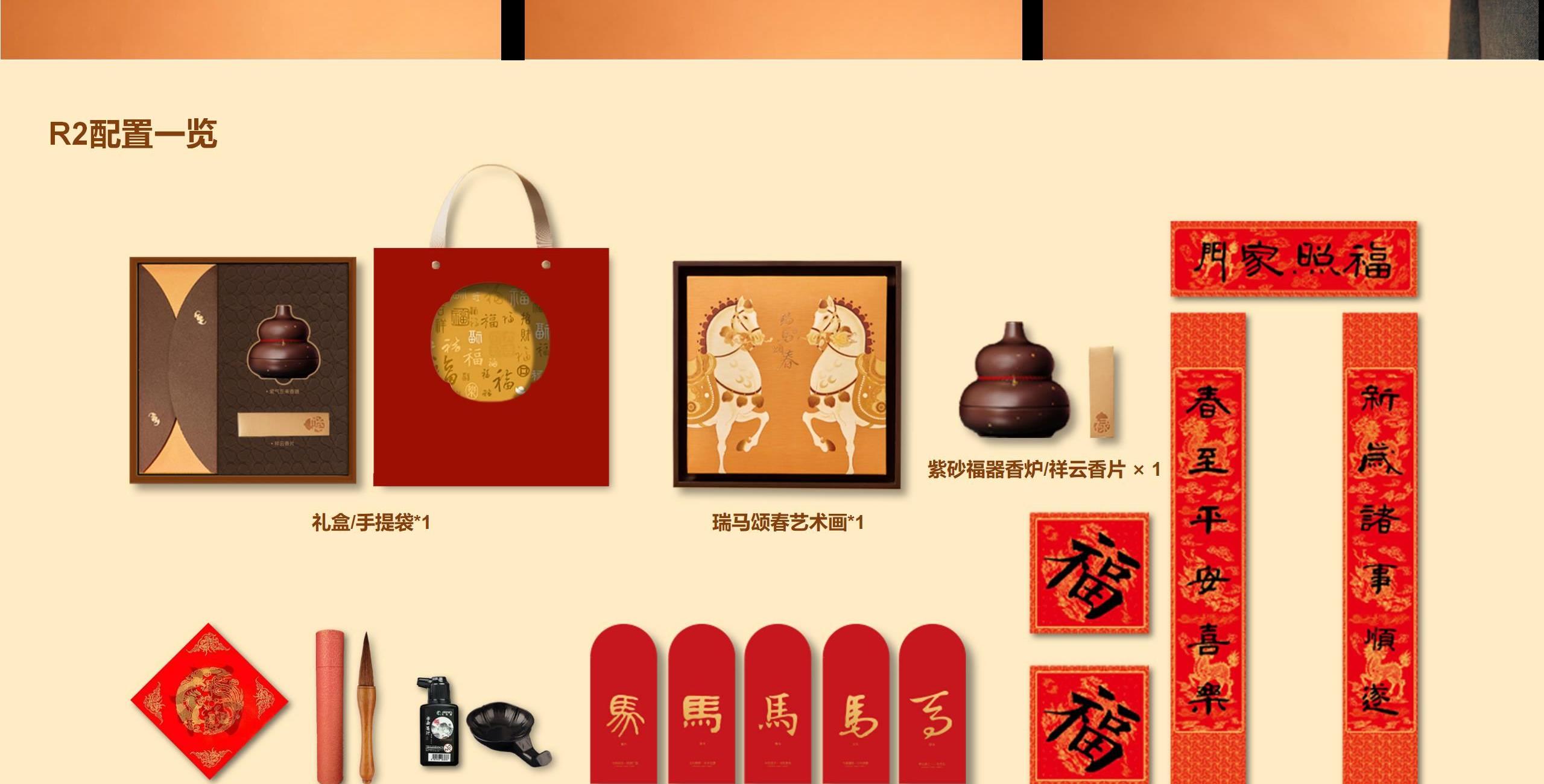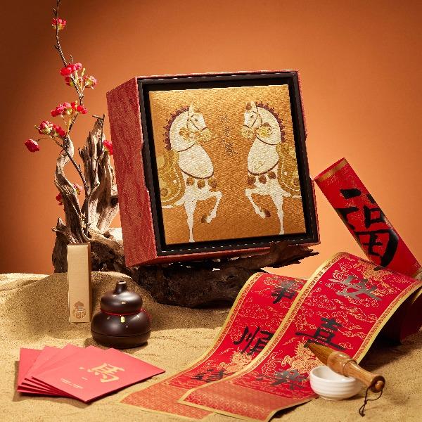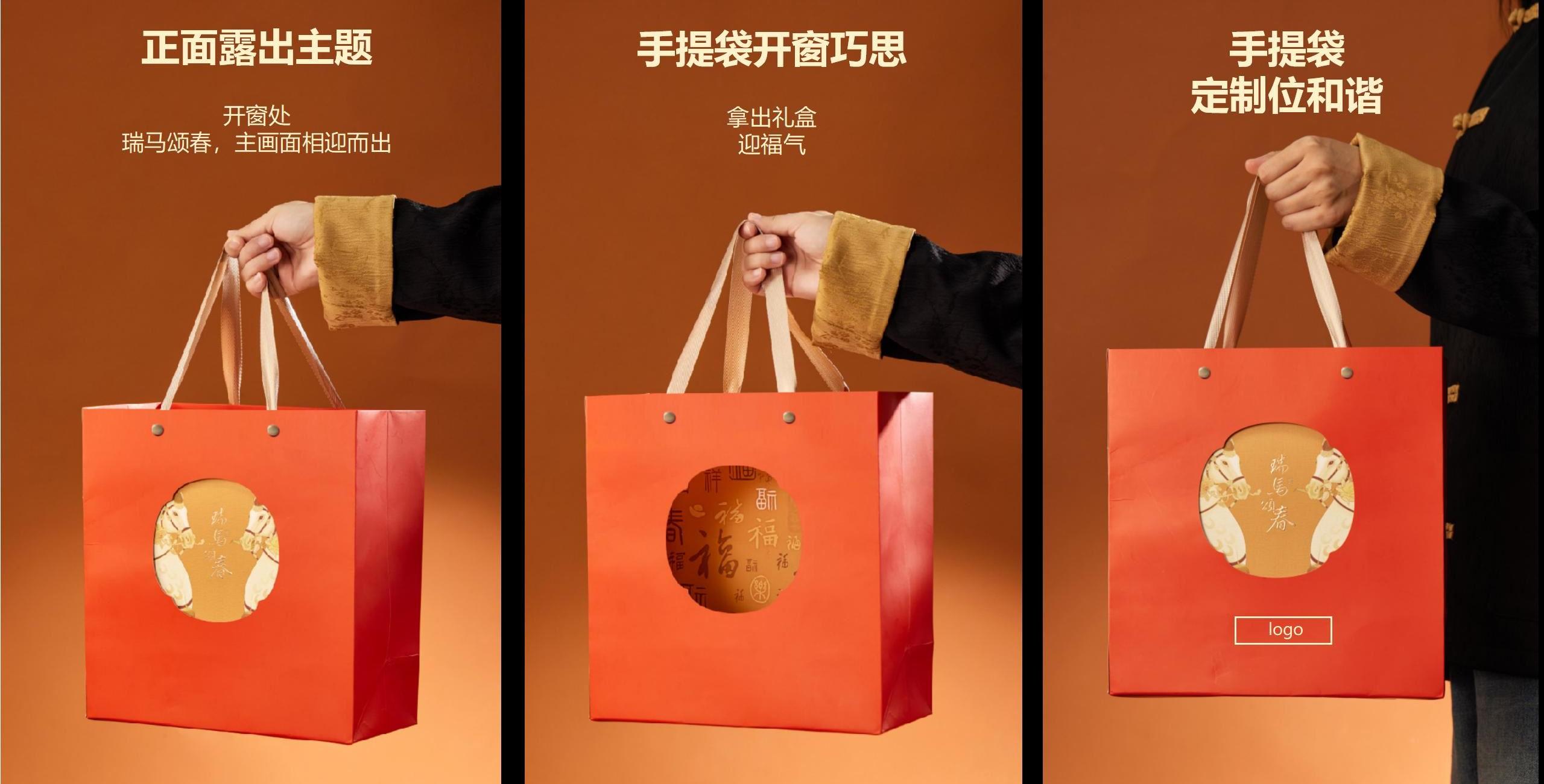 礼盒尺寸:26*26*12cm 手提袋尺寸:28*13*29cm 礼盒挂画尺寸:25.3*25.3*2cm 对联尺寸:75*13cm 设计理念:瑞马颂春是一件融合了传统智慧与现代美学的艺术佳品。它通过铜钱纹与宫廷纹样的交融,将新年对财富、团圆、吉祥的期盼,以一种极具文化自信与尊贵格调的方式娓娓道来。主视觉插画为“瑞马颂春",两匹神骏白驹对称而立,身姿轩昂,周身金色鞍具缀以繁复纹饰,尽显华贵欢愉之态。尤为点睛的是,一匹马口衔灵芝,寓意福泽悠长、智慧满溢;另一匹马则轻衔佛手传递吉祥长寿之愿,恰似春节期间传递真挚情感的信物,满着人们对新年的美好祈盼。