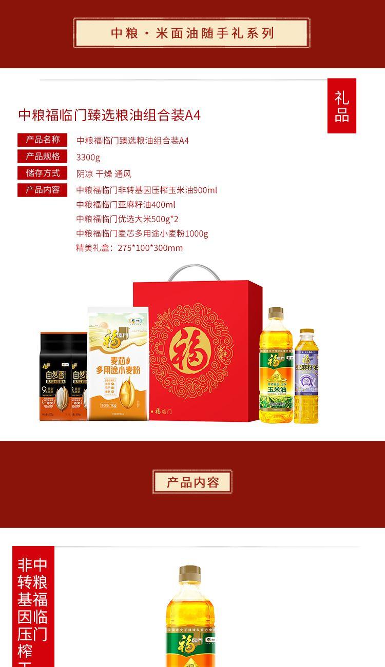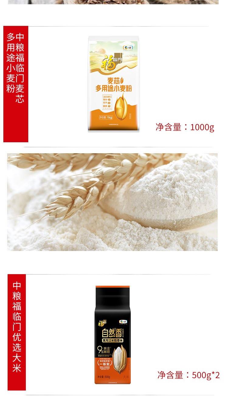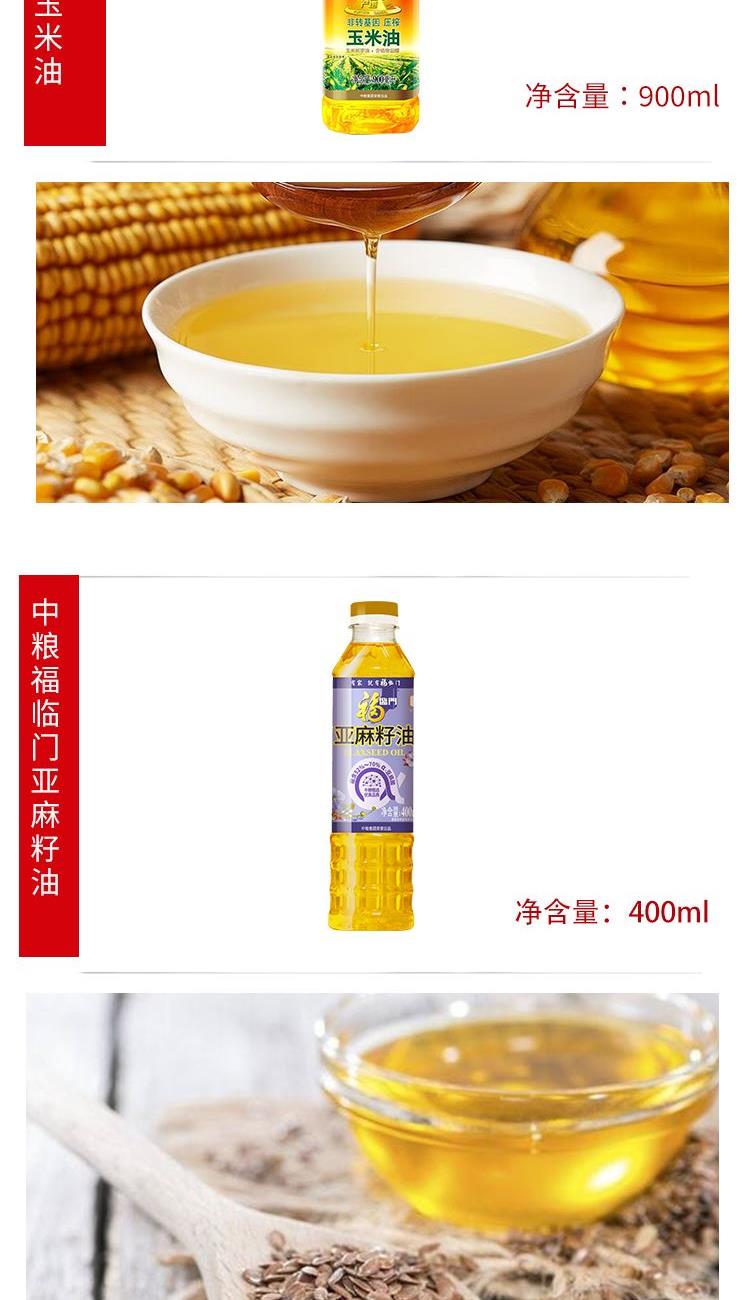 中粮福临门非转基因压榨玉米油900ml 中粮福临门亚麻籽油400ml 中粮福临门优选大米500g*2 中粮福临门麦芯多用途小麦粉1000g 精美礼盒:275*100*300mm