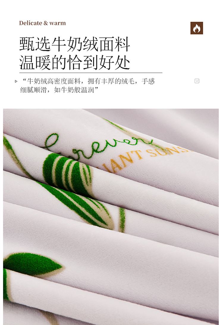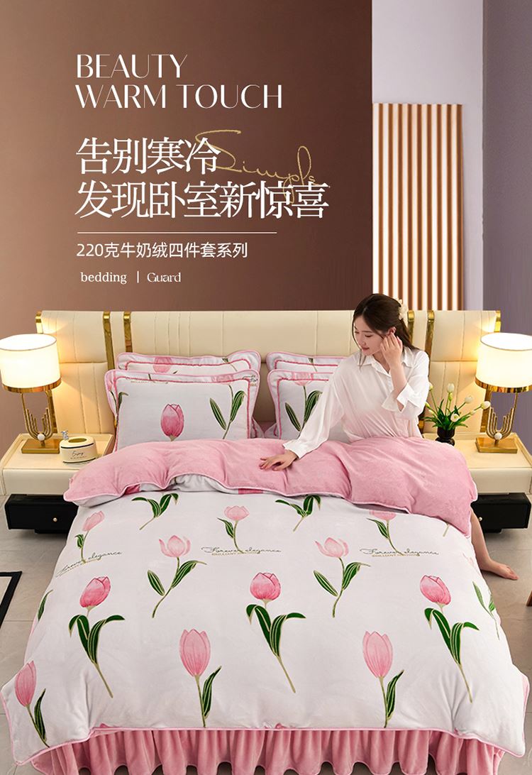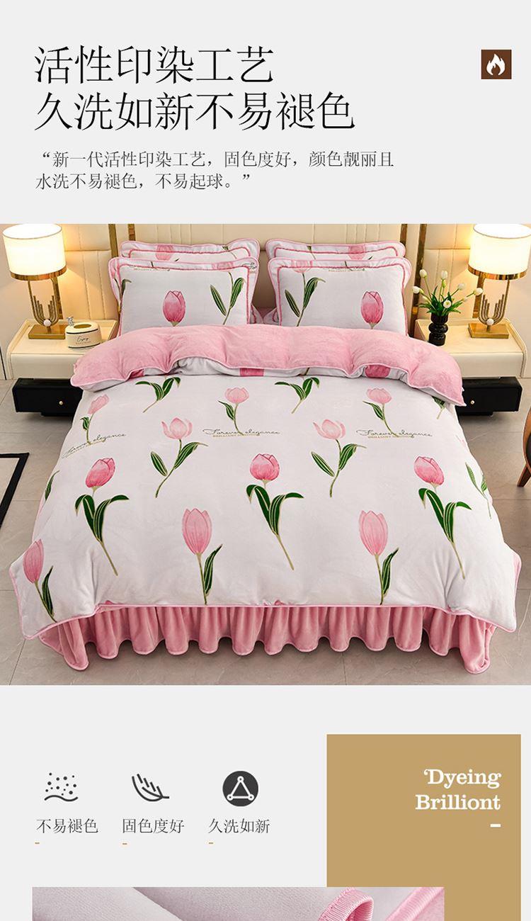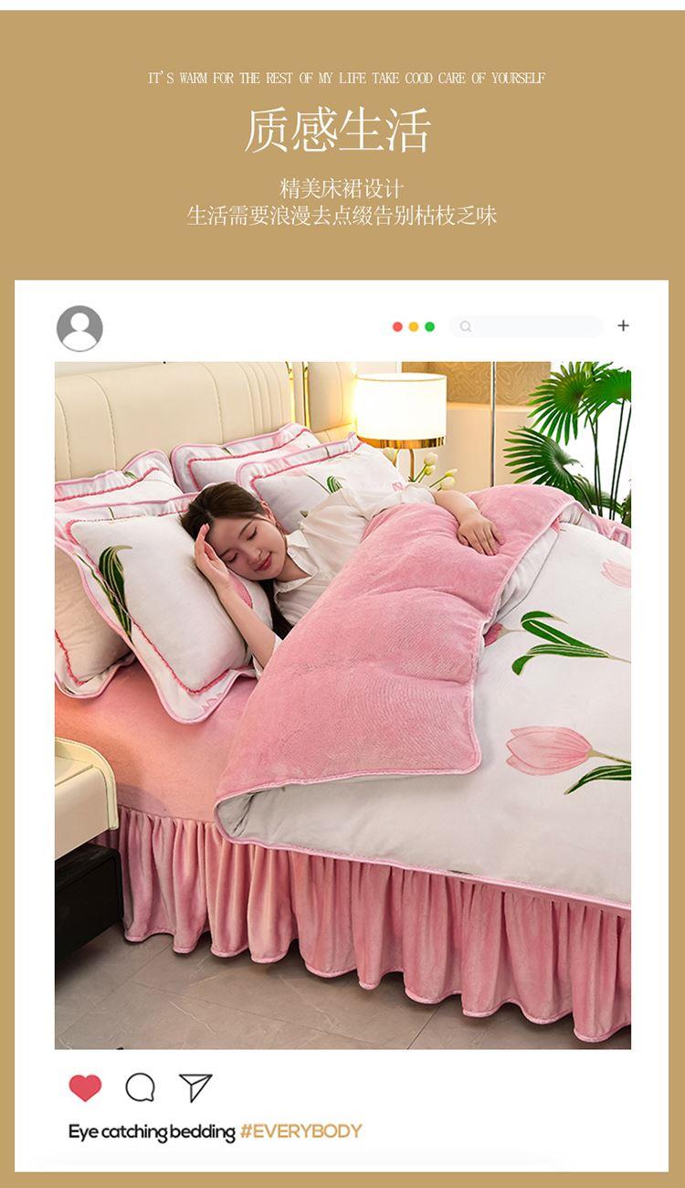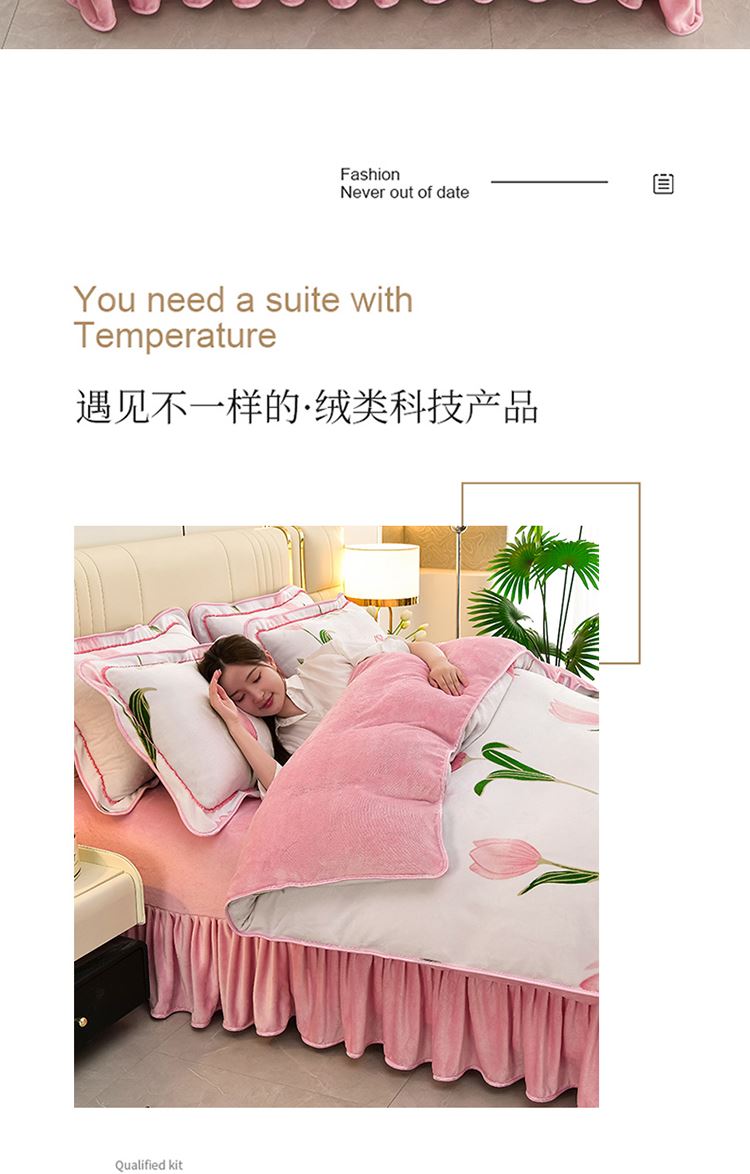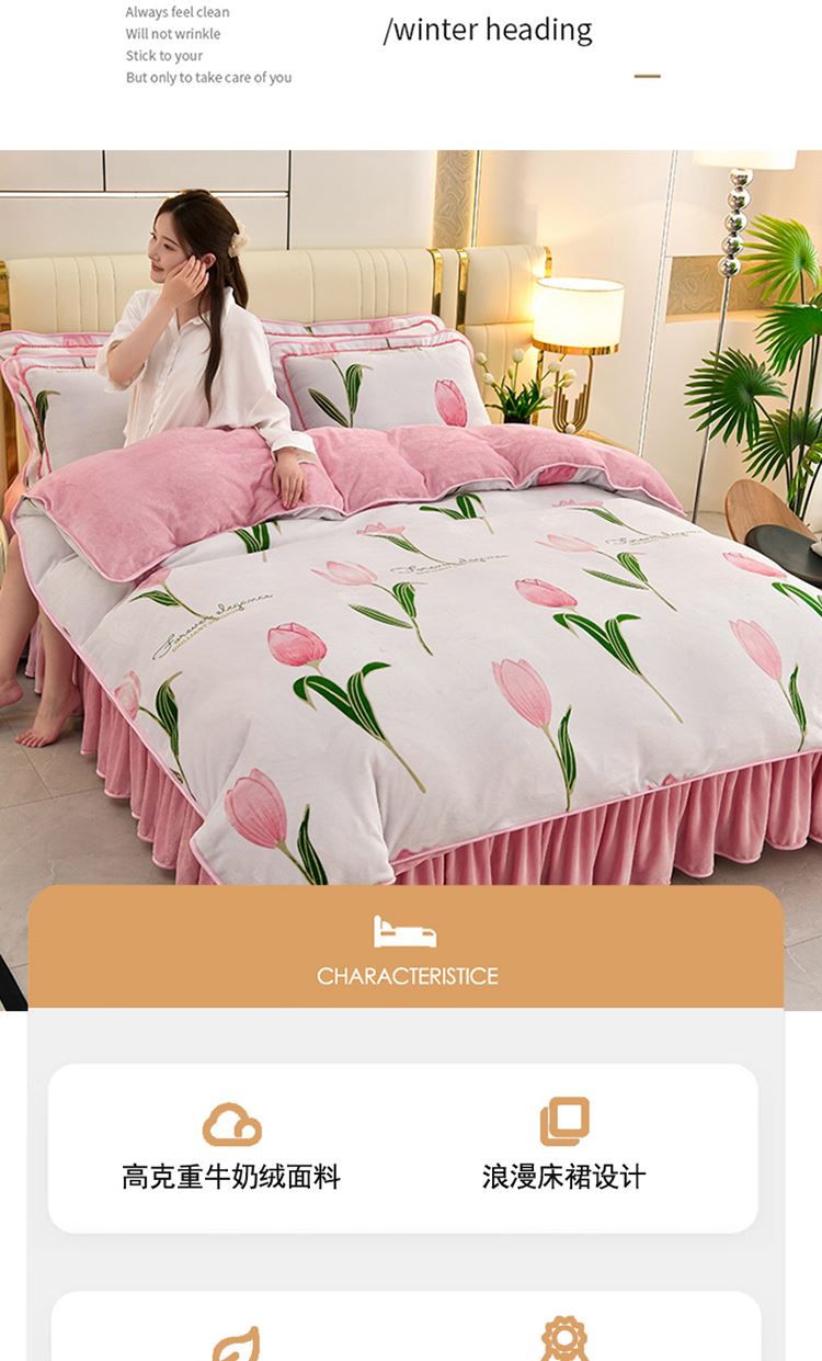 1:甄选高克重牛奶绒面料 柔软舒适 保暖亲肤触感如婴儿肌肤般一样 裸睡无忧 2:温软牛奶绒聚温力MAX 轻盈温厚,触感温软,提升被窝聚温力 3:精美时尚用印花搭配素雅纯色设计 美观简约点缀卧室 增添美感 尺寸:被套200*230cm*1 床裙:250*250cm*1 枕套:48*74cm*2 重量:约4.1kg 包装:彩盒/礼袋