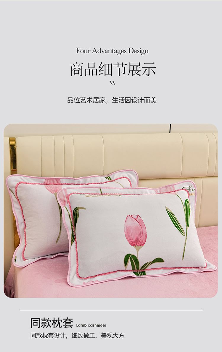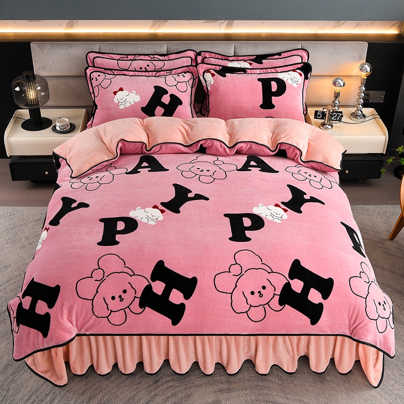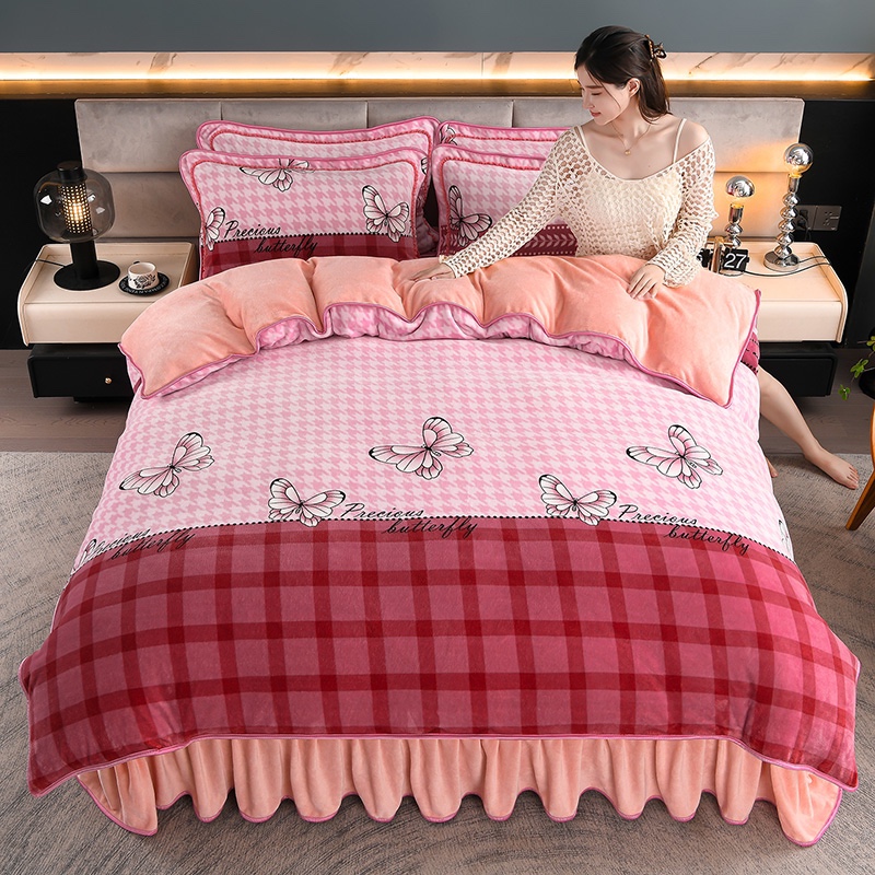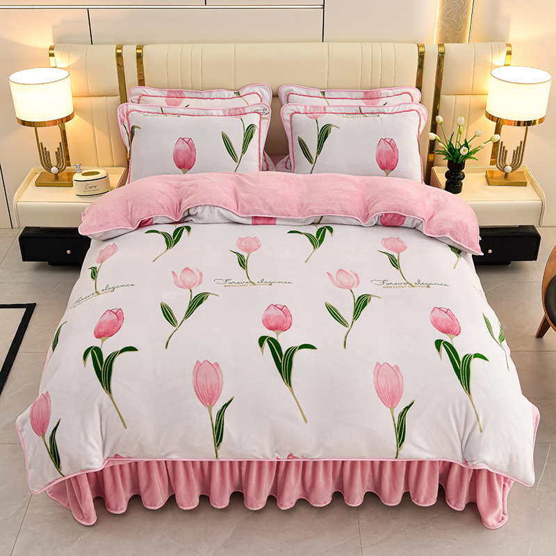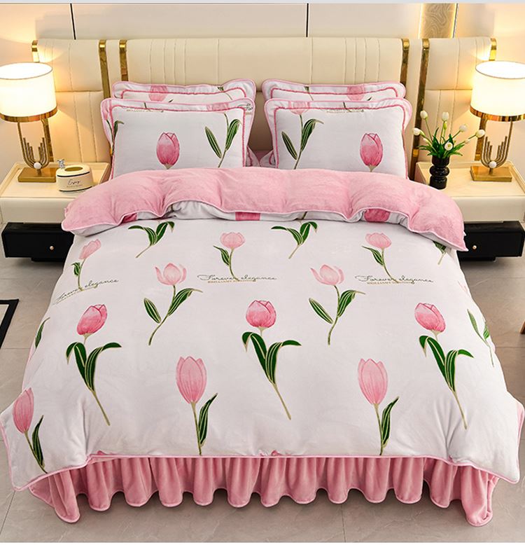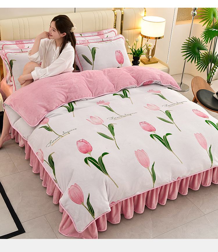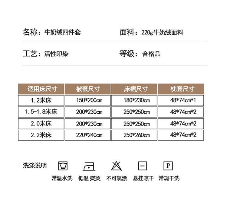 1:甄选高克重牛奶绒面料 柔软舒适 保暖亲肤触感如婴儿肌肤般一样 裸睡无忧 2:温软牛奶绒聚温力MAX 轻盈温厚,触感温软,提升被窝聚温力 3:精美时尚用印花搭配素雅纯色设计 美观简约点缀卧室 增添美感 尺寸:被套200*230cm*1 床裙:250*250cm*1 枕套:48*74cm*2 重量:约4.1kg 包装:彩盒/礼袋