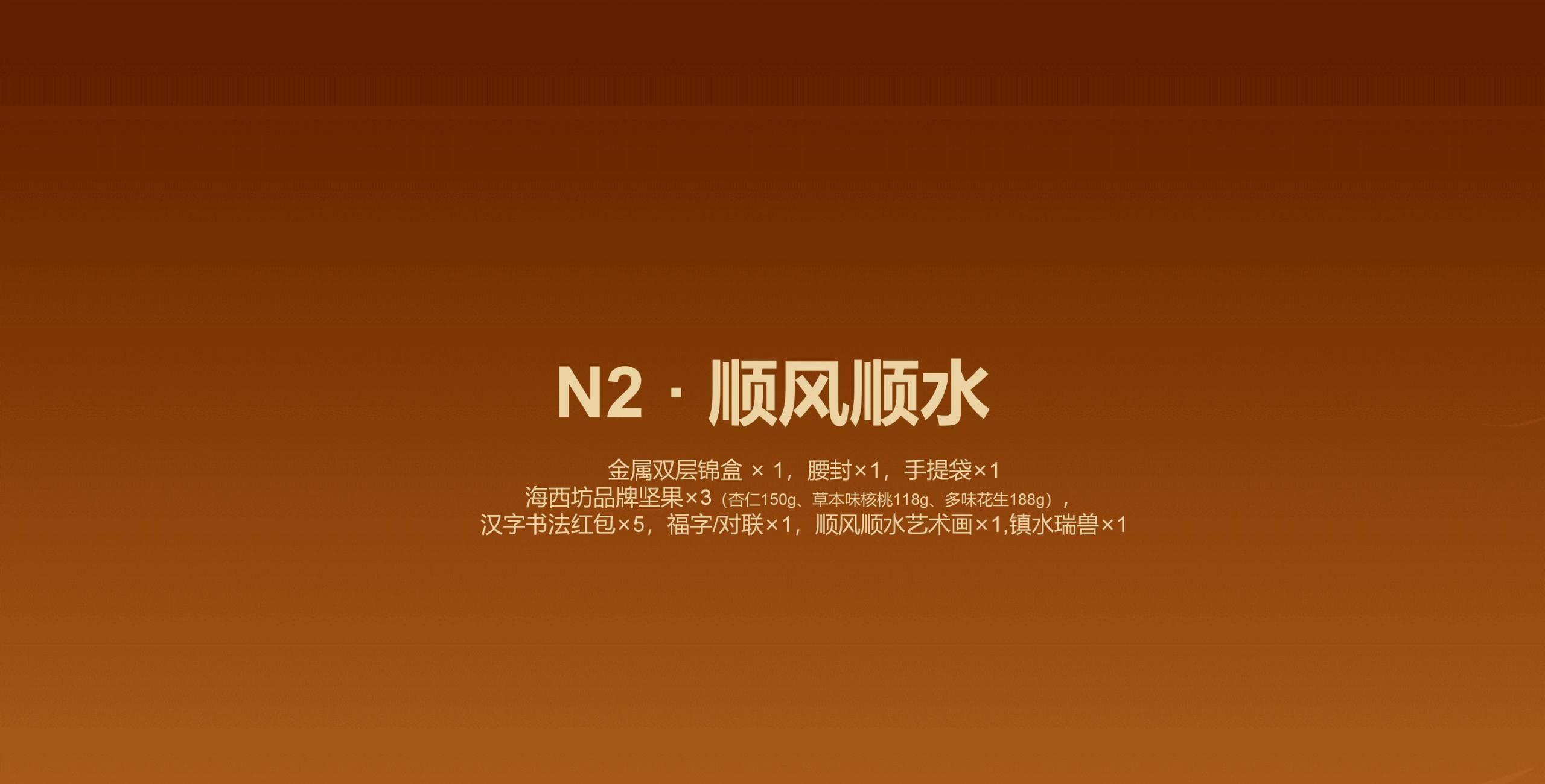 月宴礼盒尺寸:25*25*15.5cm 手提袋尺寸:27.5*27.5*17cm 相框尺寸:20*20*2cm 镇水兽尺寸:6*3*3cm 坚果克重:杏仁150g、核桃118g、多味花生188g 设计理念:《年宴》是一款还原云宫之宴场景的文化礼盒产品。将传统锦盒以现代马口铁+亚克力材质呈现,传统而不失现代感。 选用了铜钱纹、桂花纹、海棠纹,三纹交织。 铜钱纹藏福,桂花纹沁香,海棠纹叠韵。 以素雅宫廷纹样铺陈,重现年宴的千年风雅。 这一盒,盛的是仙家清贵,载的是人间团圆。 邀您细品云宫之宴走出的新年至味。