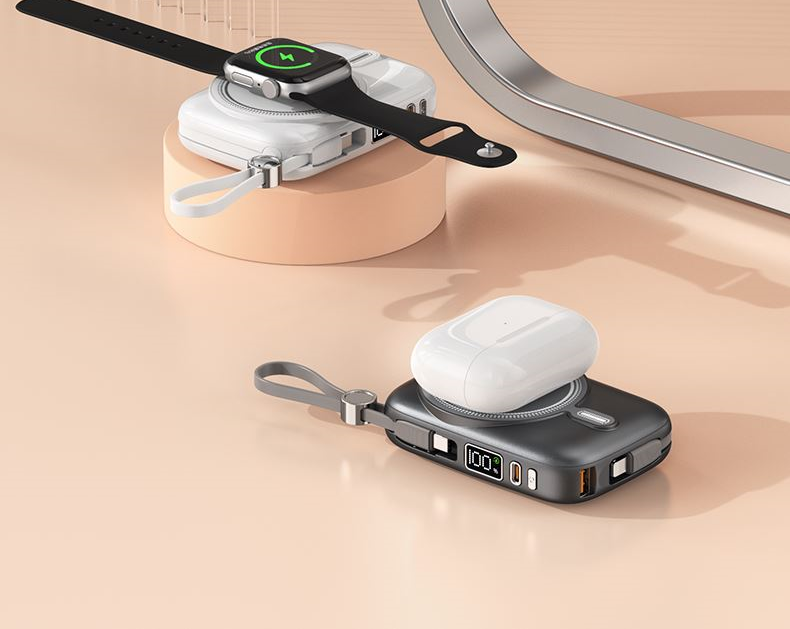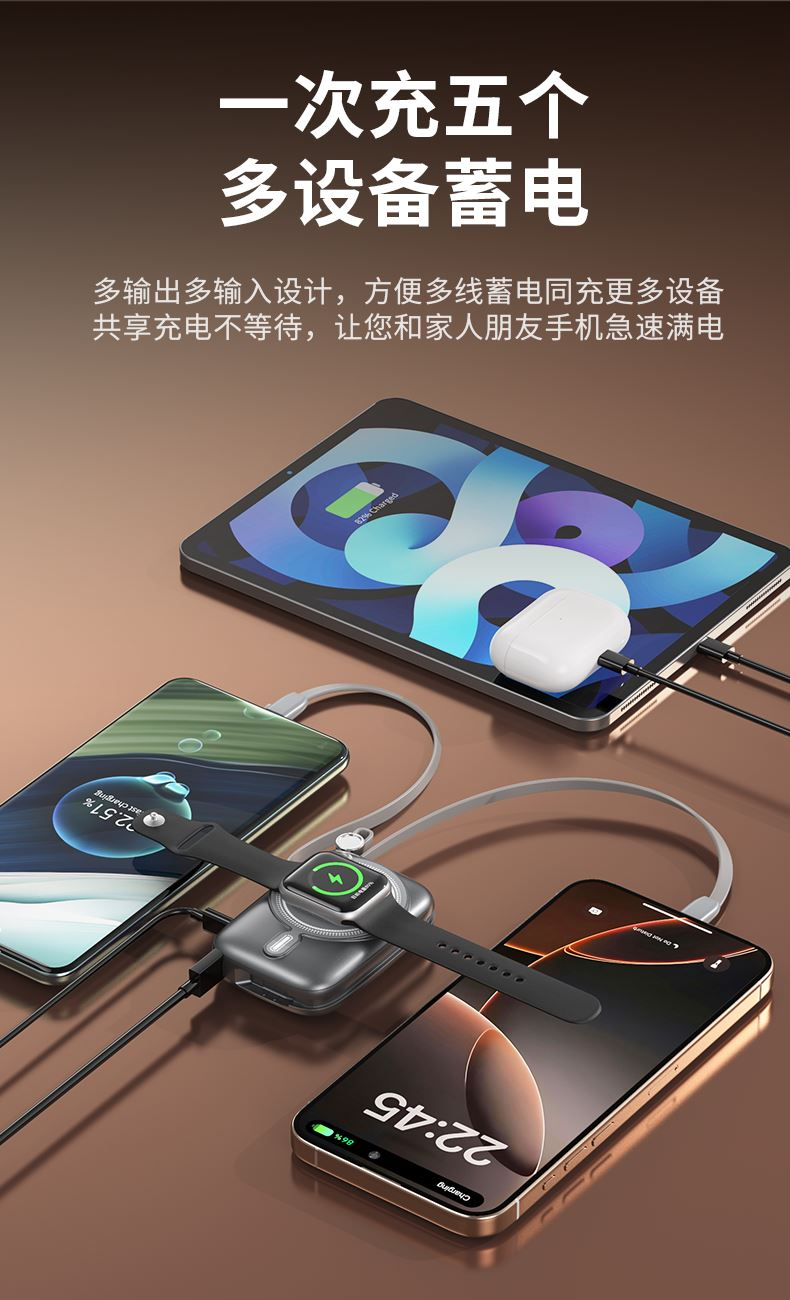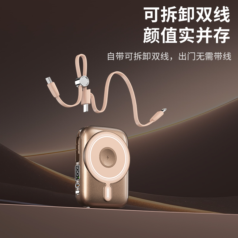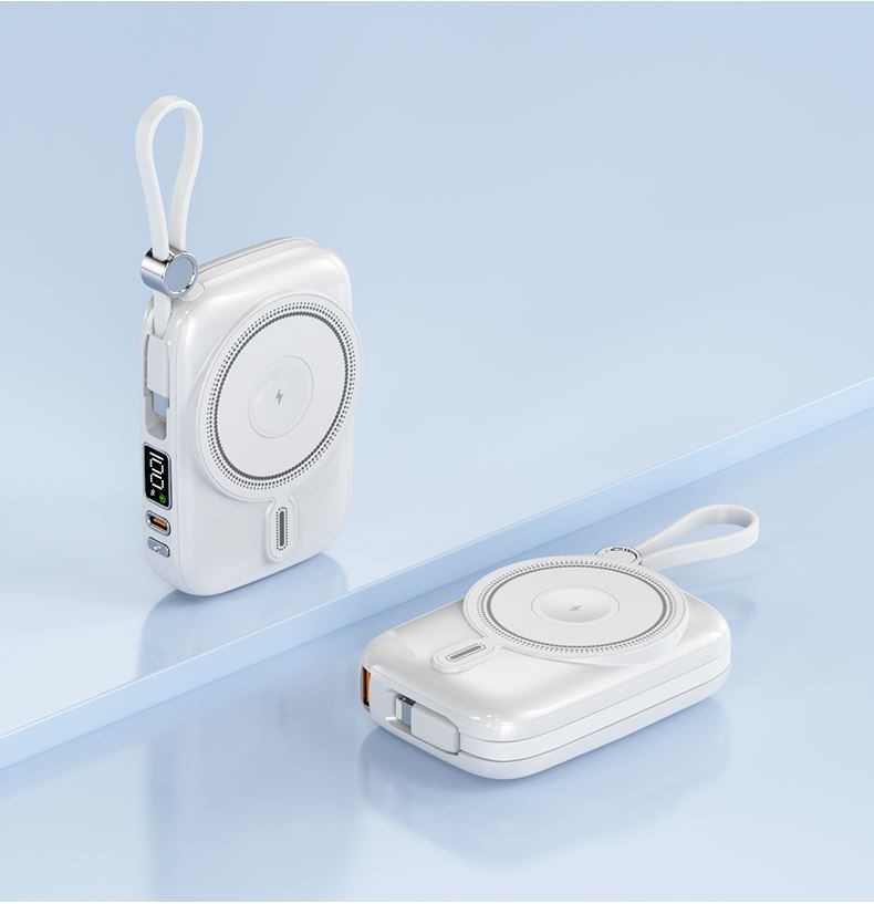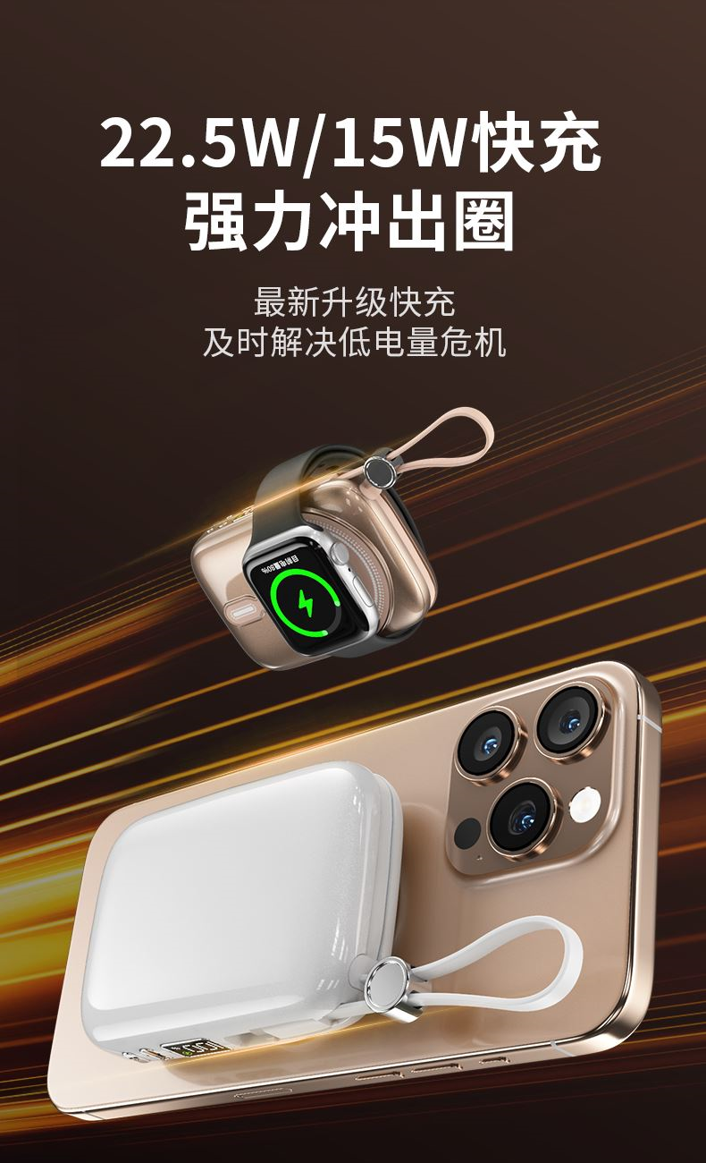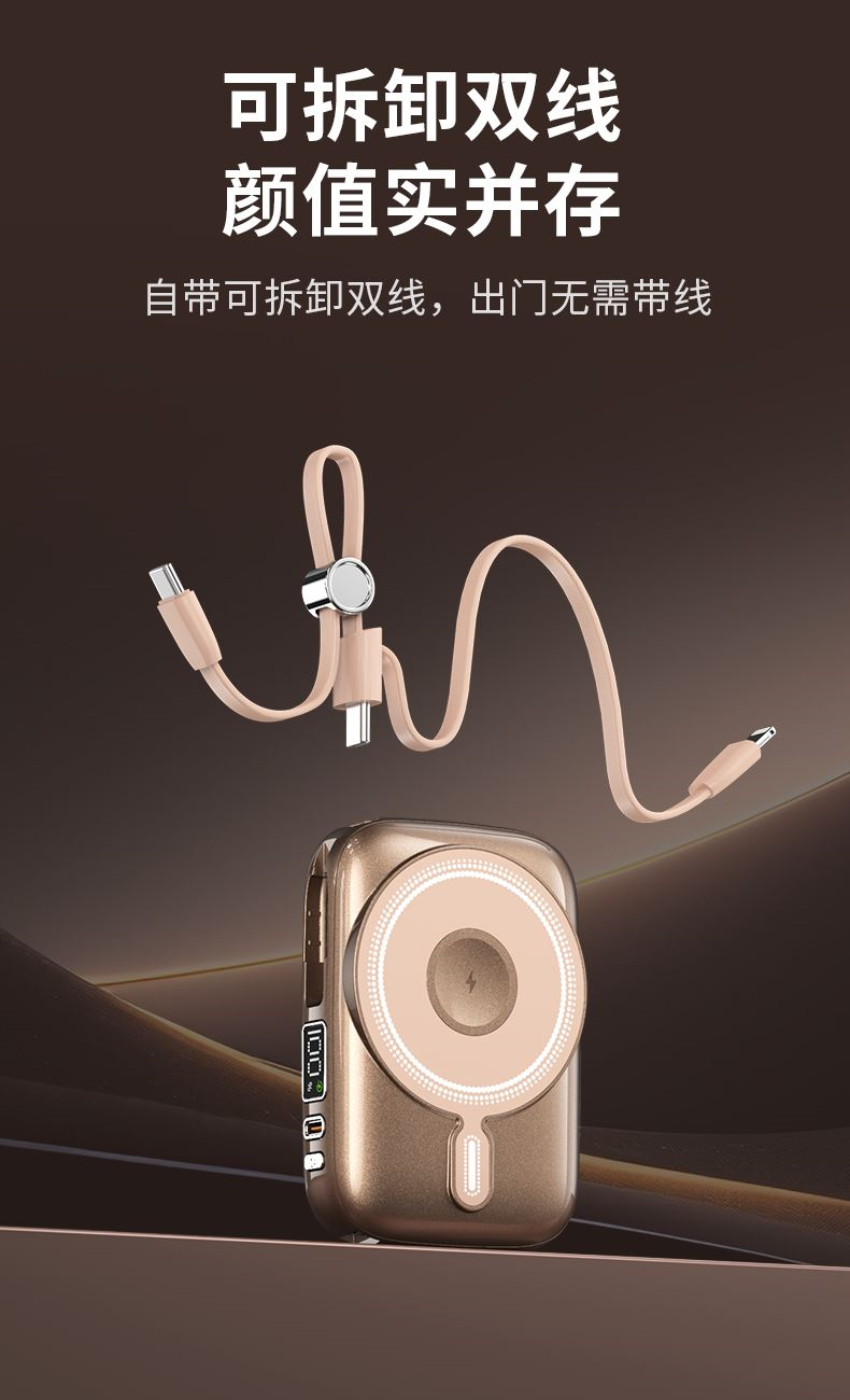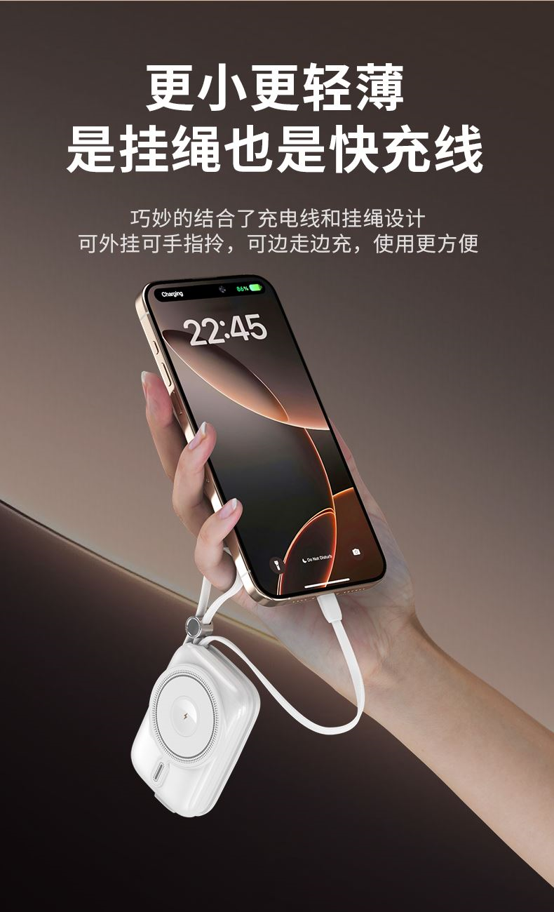 奥苏米开门红3C认证商务磁吸无线充快充移动电源 型 号: 106S 电池 :21700*2pcs 电池类型 :动力电芯 容量:10000mAh 材质 :ABS+PC 尺寸 :82*62*28.5mm 颜色 :珍珠白 功能特点 简约设计风格,时尚大气; 磁吸15WK快充 22.5W超级快充,迅速充电; 10000mAh锂电池,澎湃动力; 自带线可插拔, 自带苹果和Type-C充电线都的快充 可双项快充,支持苹果15手机 智能数显查看电量