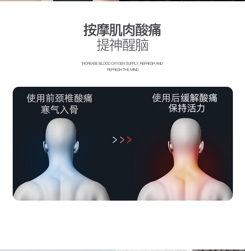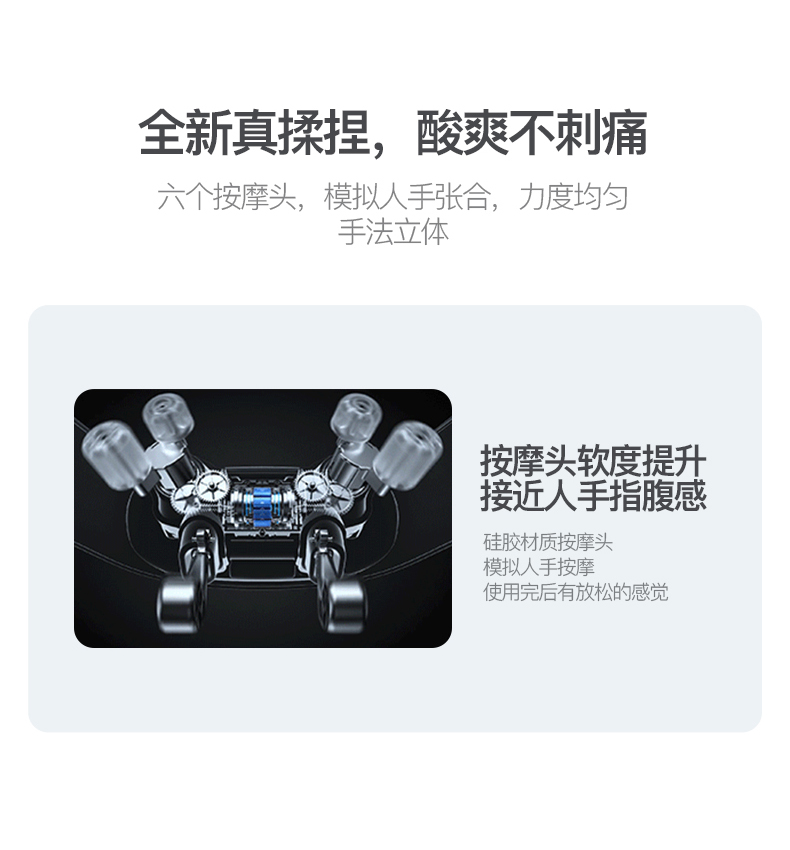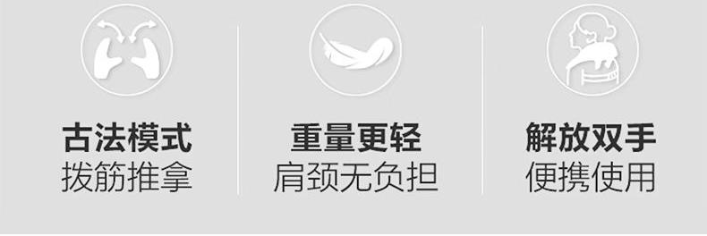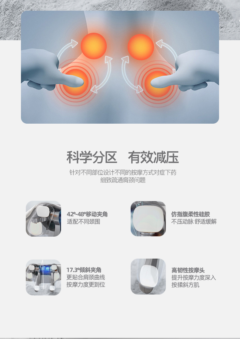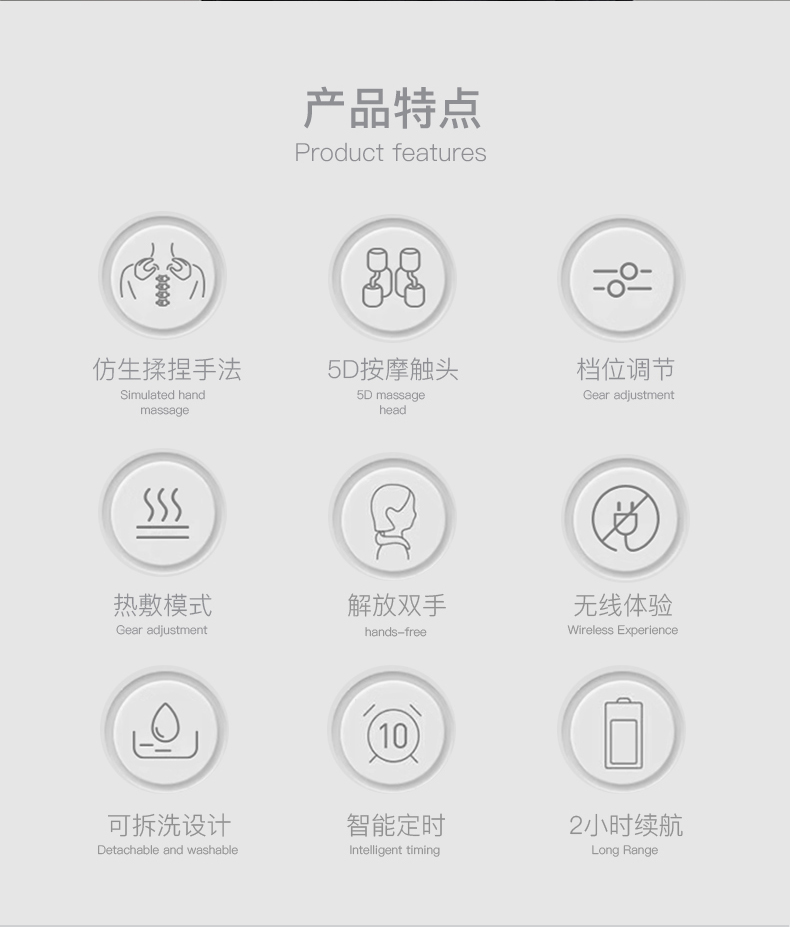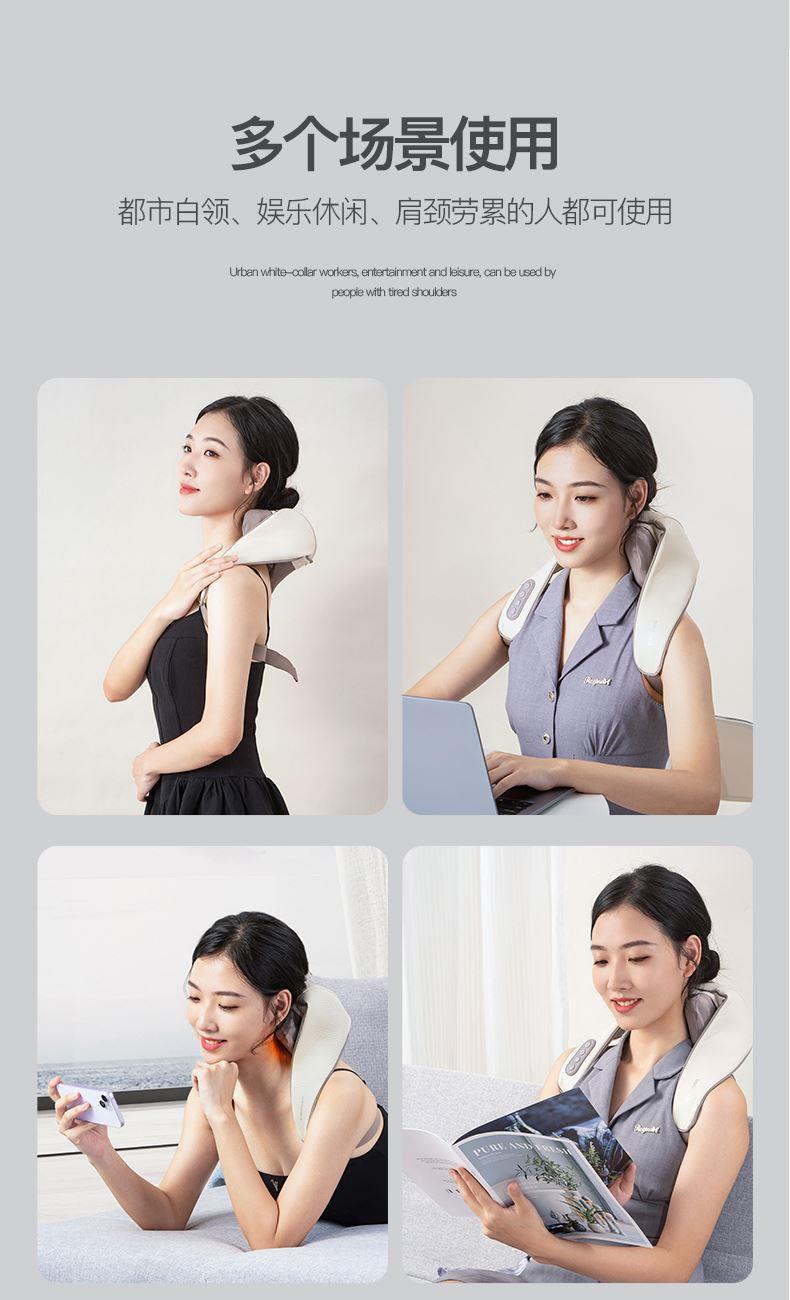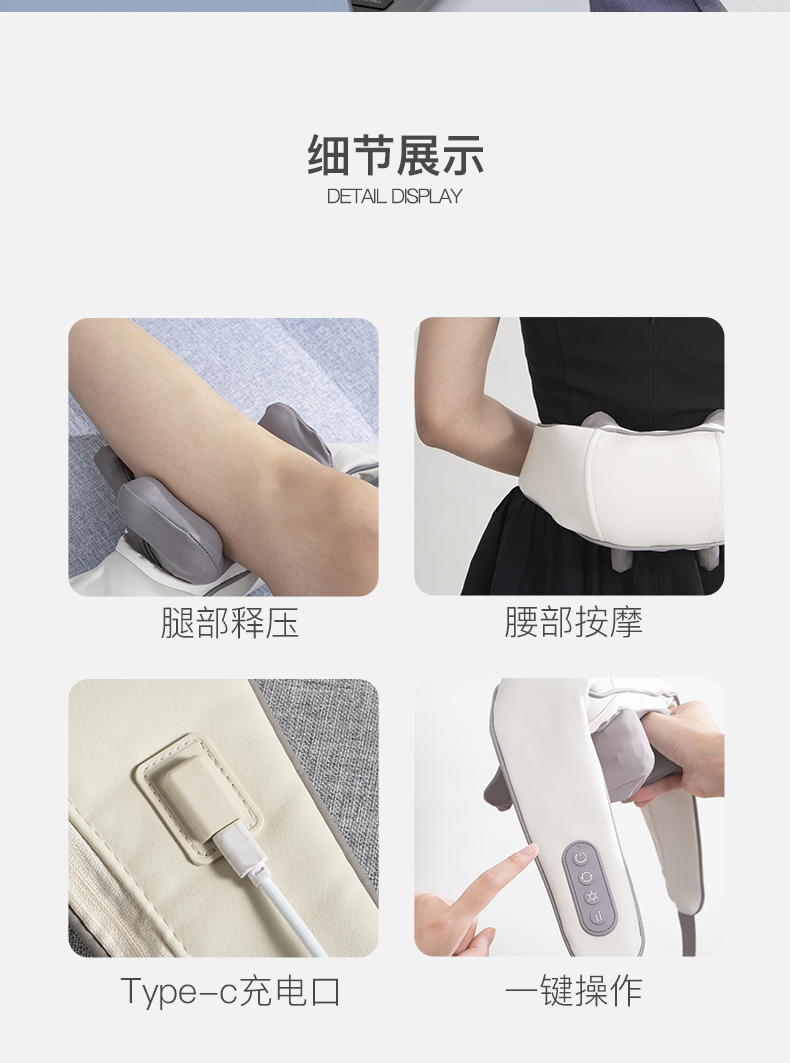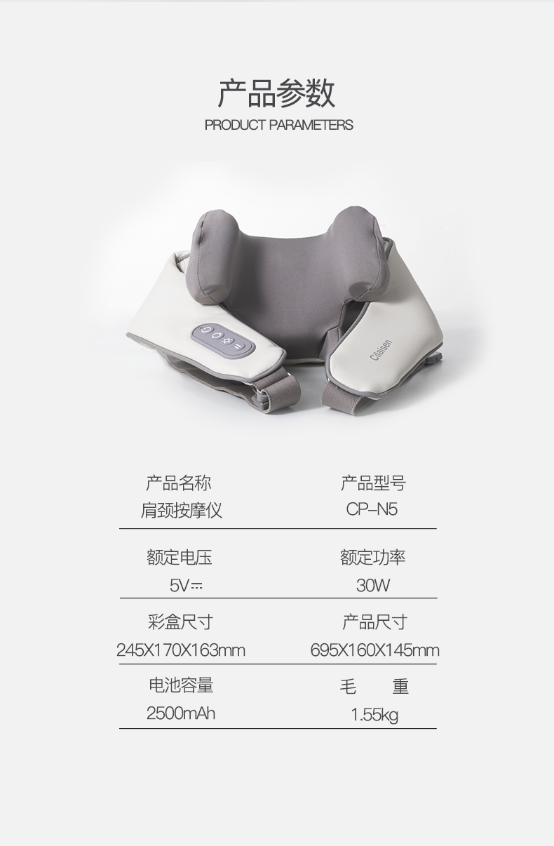 颜色:奶白 额定电压/功率:5V/30W 电池:2500mAh 产品尺寸:695X160X145mm 产品净重: 1.25kg 包装清单:主机X1,说明书,数据线X1 核心卖点: 1. 模拟人手八字揉捏,力度大,效果好 2、5D按摩头 覆盖面积大,一次放松到位 3、2档力度调节+2档热敷模式,舒适呵护肩颈 4、肩背式设计,解放双手;大容量电池,超长续航 5、10分钟智能定时;一机多用,想按哪里就按哪里