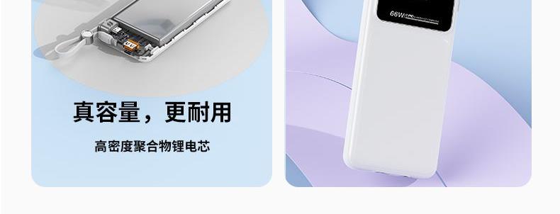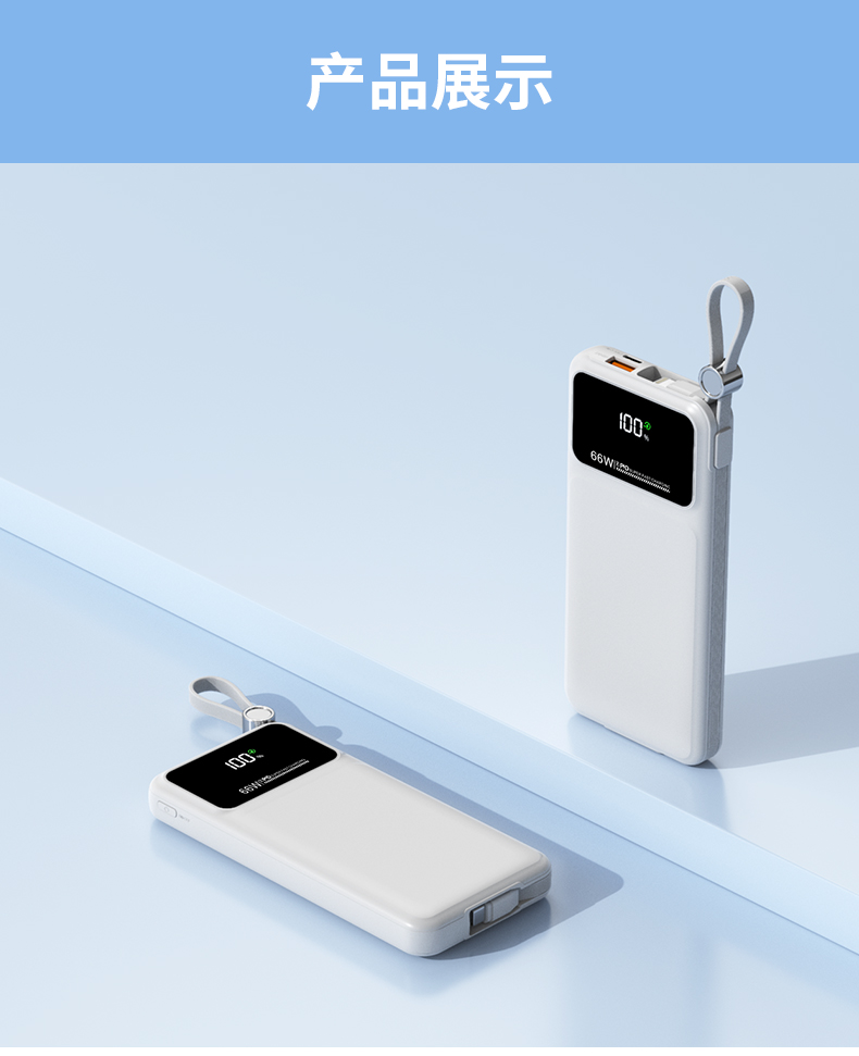 奥苏米开门红3C认证提绳超级快充内置线移动电源108A 型 号: 108A 电池 :聚合物*1pcs 电池类型 :聚合物电芯 容量:10000mAh/20000mAh/30000mAh 材质 :ABS+PC 尺寸 :147*19*68MM 颜色 :白色 功能特点 简约设计风格,时尚大气; 22.5W超级快充,迅速充电; 10000mAh锂电池,澎湃动力; 自带苹果和Type-C充电线; 二输入三输出,支持苹果15手机 智能数显查看电量