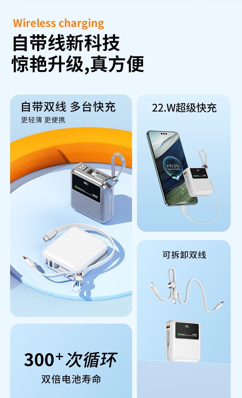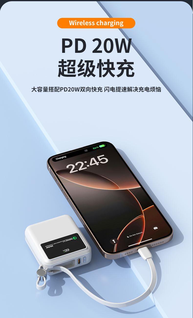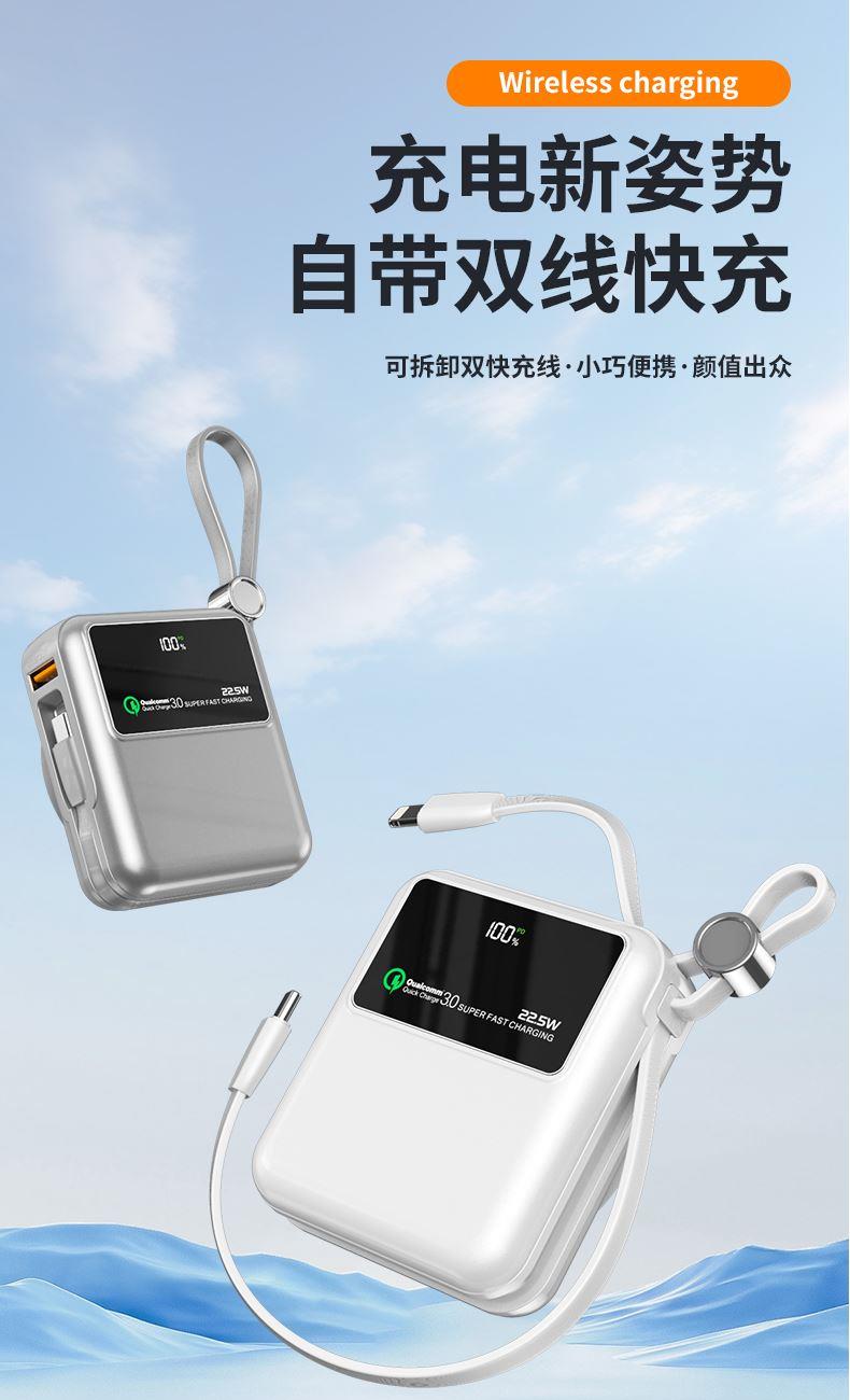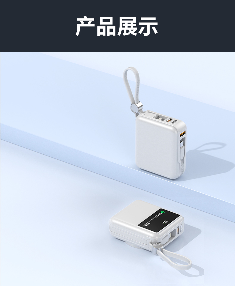 奥苏米开门红3C认证MINI时尚超级快充方形宝 型 号: 101A1 电池 :聚合物 电池类型 :聚合物电芯 容量:10000mAh 材质 :ABS+PC 尺寸 :71*61.5*26mm 颜色 :白色 /银色 功能特点 迷你小巧,跟方块小纸巾大小 ; 22.5W超级快充,迅速充电; 10000mAh聚合物锂电池; 自带苹果和Type-C充电线; 一输入三输出,支持苹果15手机 智能数显查看电量