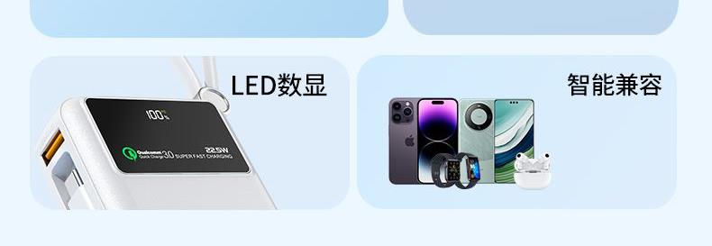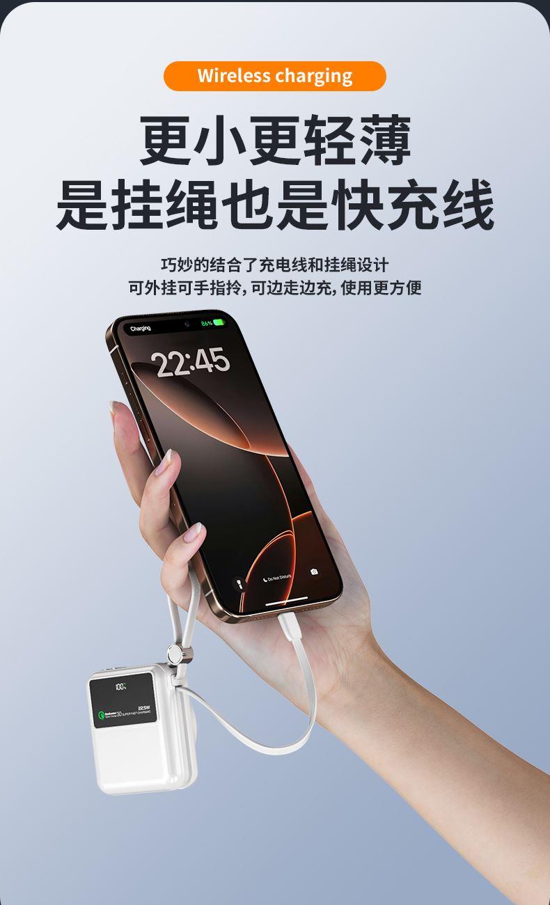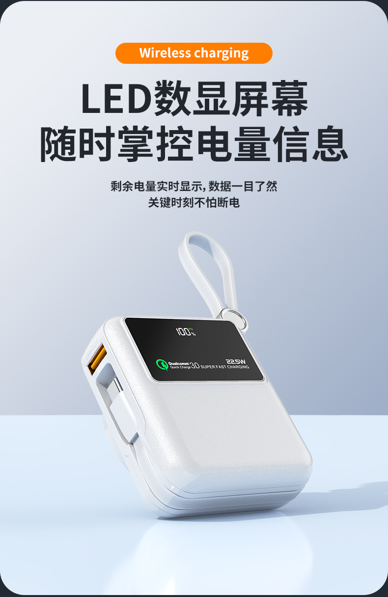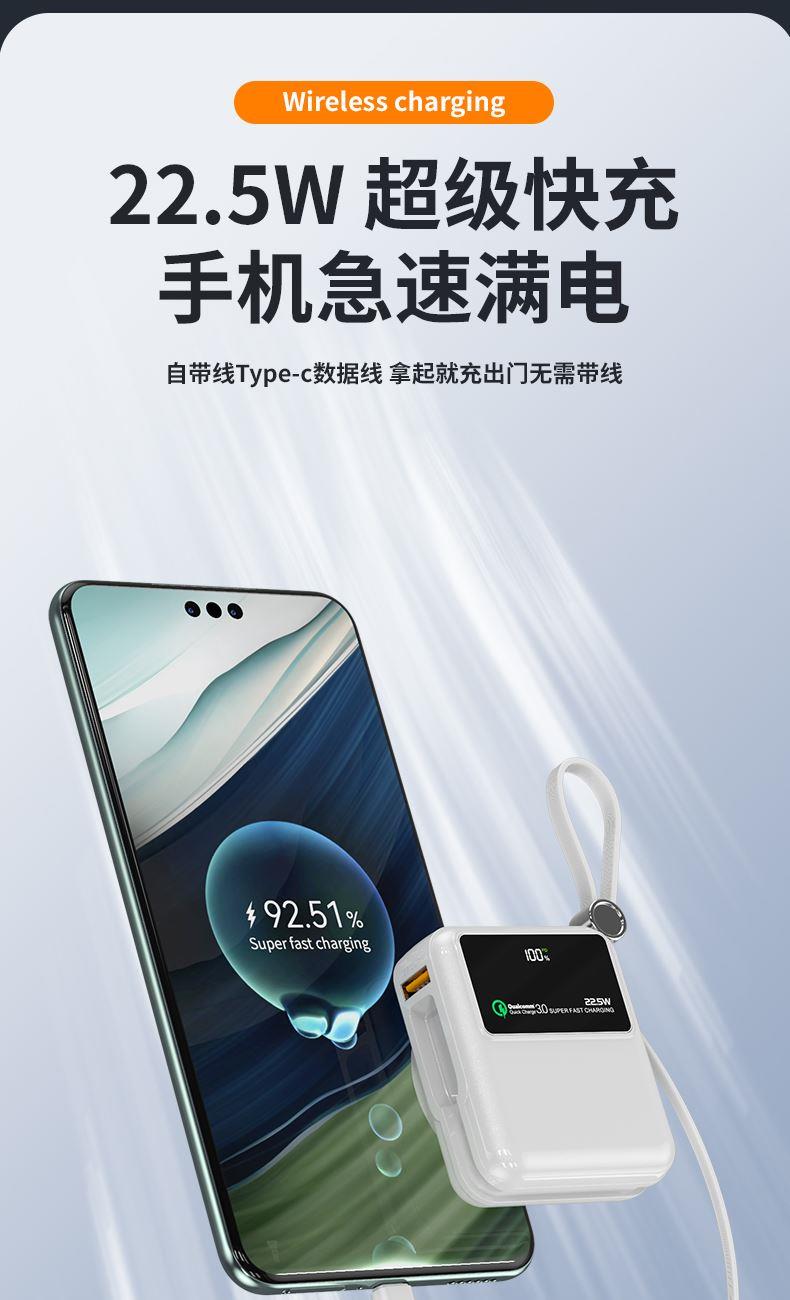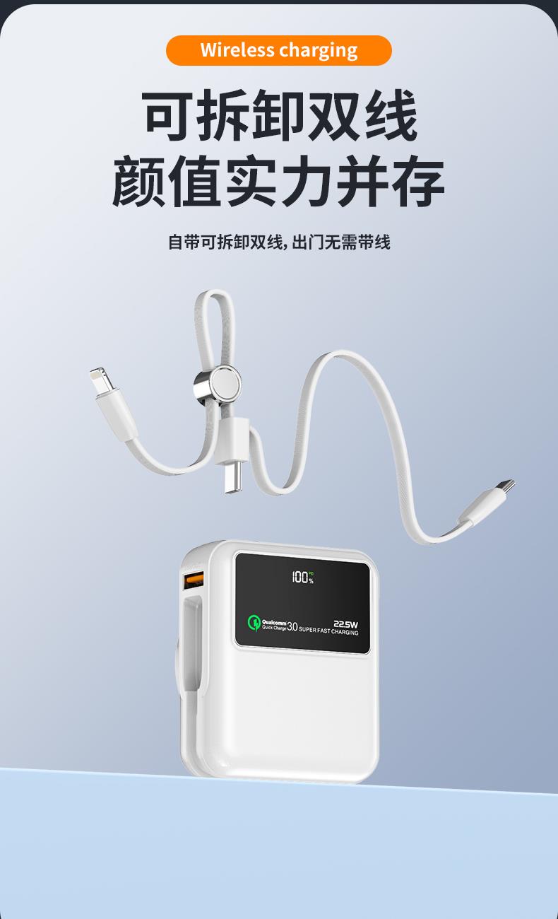 奥苏米开门红3C认证MINI时尚超级快充方形宝 型 号: 101A1 电池 :聚合物 电池类型 :聚合物电芯 容量:10000mAh 材质 :ABS+PC 尺寸 :71*61.5*26mm 颜色 :白色 /银色 功能特点 迷你小巧,跟方块小纸巾大小 ; 22.5W超级快充,迅速充电; 10000mAh聚合物锂电池; 自带苹果和Type-C充电线; 一输入三输出,支持苹果15手机 智能数显查看电量